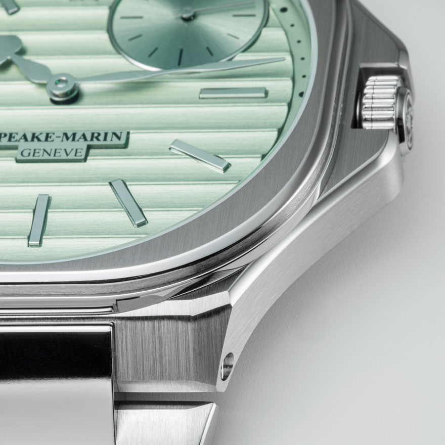 ケースは、ポリッシュ/サテンブラッシュ仕上げのステンレススティール製で、丸みを帯びた面取りとポリッシュ仕上げのエッジを持つスタイリッシュな八角形ベゼルに、ねじ込み式のリューズが特徴。ケースサイズは直径40.3mm、厚さはアンダー10mmの心地よい着用感とエレガントな印象の薄型ケースが知的な雰囲気を醸し出している。