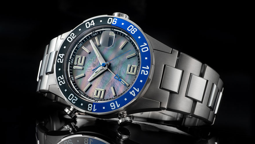 2020 年に「ロードマスター マリン GMT」を、その翌年に「ロードマスター パイロット GMT」をリリースするなど、ロードマスターシリーズは年を追うごとに人気を獲得してきた。ボール ウォッチではめずらしいブレスレット一体型のスタイリッシュな外観が共通の意匠で、GMT モデルは第2 時間帯表示の調整をスムーズに行えることが支持されている理由だ。今回の『ロードマスター パイロット GMT ブラックMOP』は、短針が単独可動する“パイロット GMT”をベースに、光の加減や見る角度によって様々な表情を見せるブラック マザー・オブ・パールを文字盤に使用。天然素材であることから光沢や色合いに同じものがなく、一点もののプレミアム感が魅力だ。