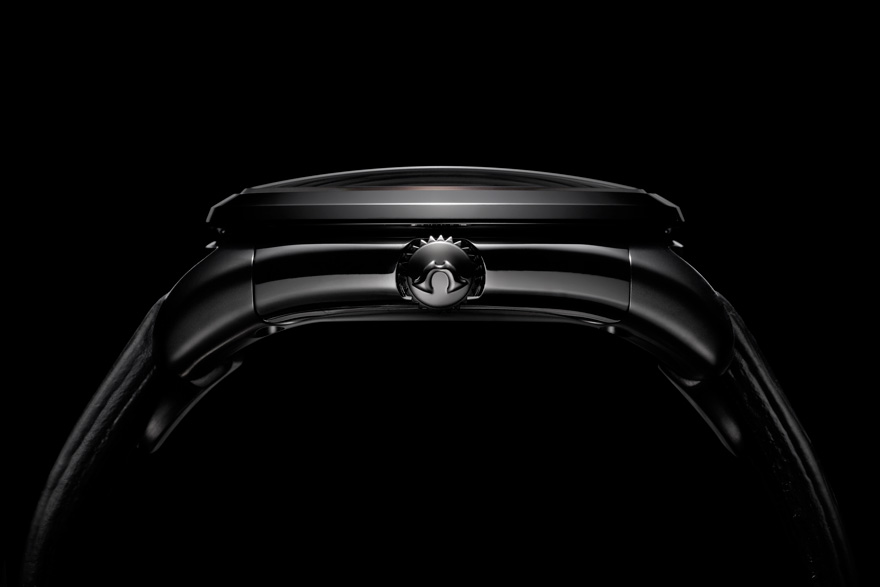 本作の特徴は、まるで漆黒の夜空のようなオールブラックに統一された外装にある。滑らかなラインを描くステンレススティール製のケースには、耐摩耗性に優れるデュラテクトDLCが施され、ブラックカラーのスモールクロコダイルストラップが装着されている。