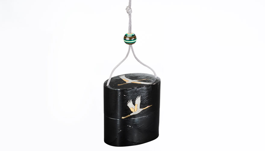 クリストフ・トレメールが山下氏へリクエストして描かれた日本の特別天然記念物のタンチョウヅルは、3 羽が雄々しく翼を広げ翼の一部に「存清」が用いられている。波立つ海は黒漆に木綿豆腐を加えて練ったもので「絞漆(しぼうるし)」の技法で表現されている。「彫漆」の技法で作られた緒締玉は、約 15 色のカラフルな漆で作られている。