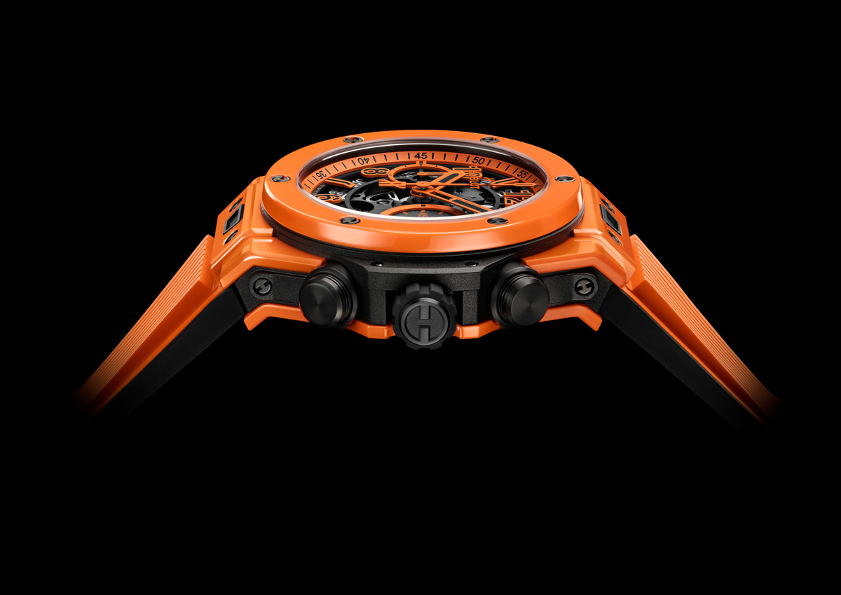 さまざまな独自素材の研究開発に力を入れているウブロは、2019年に世界初となる鮮やかなレッドセラミックス、21年にはこちらも世界初となるイエローセラミックスを発表している。今回のオレンジはそれに続く新たなセラミック素材である。
