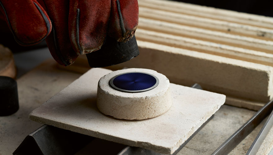 主役は、自社工房で入念に仕上げられたグラン・フー エナメルの文字盤だ。文字盤のベースとなるのはサンレイ・モチーフ、ギヨシェ仕上げを施したシルバーのディスクである。そして、シリカ、鉛丹、カリ、炭酸ソーダを混合してパウダー状にし、金属酸化物と結合して目指すインディゴブルーを作り出すことから魔法が始まる。この粉末を真鍮製のディスクに吹き付けてから約800°Cで焼成する。職人が文字盤を炉から取り出すタイミングを見極め、外観を損ねないよう細心の注意を払って冷却する。ジラール・ぺルゴが目指す美しい光沢が得られるまで、この工程を 5~10回繰り返す。このように忍耐と高度な技術の賜物である文字盤であっても、小さな亀裂や気泡、その他の不具合が生じることがあり、そうなれば完成品としては認められず、最初からやり直しとなる。製造にかなりの時間がかかるグラン・フー エナメルの文字盤は、文字通り、決して色褪せぬ魅力を約束してくれる。