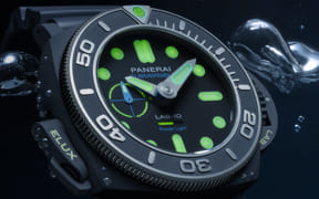 文字盤は、ブラックからアンスラサイトへのグラデーションが特徴で、ベージュのスーパールミノバがアクセントとなり視認性を確保している。ねじ込み式のDLC加工が施されたチタン製裏蓋により、腕時計の防水機能が50気圧に向上し、厳しい水中ミッションでも使用できる。自動巻き(Cal.P.9100/R)。37石。2万8800振動/時。パワーリザーブ約3日間。DLC加工Tiケース(直径47mm、厚さ18mm)。50気圧防水。518万1000円(税込み)。世界限定80本。