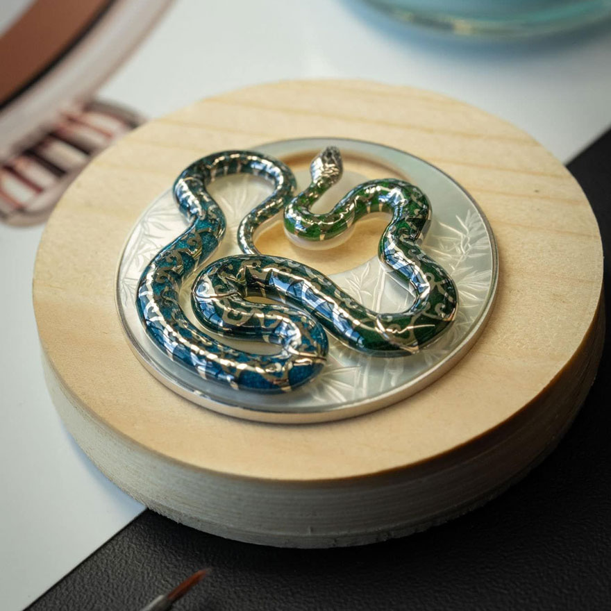 蛇にオマージュ(敬意)を捧げたモデルは非常に稀であろう。ジャケ・ドローでも、ここ12年間、作っていなかったが、東洋の暦法の干支で巳年にあたる、来るべき新年(2025年)に向けて、マザー・オブ・パールとソノラ・サンライズの文字盤を備えたふたつのユニークなモデルを発売することとなった。しかも、初の試みとして針を廃し、前例のないレベルの芸術的な職人技が駆使されている。曲がりくねったソリッドゴールド製の蛇の体には、グラデーションカラーのエナメル装飾が施され、さらにジャケ・ドローのパートナーで「ロード・オブ・ザ・リング」のイラストレーター兼コンセプチュアル・アーティストでもあるジョン・ハウ氏がデザインしたモチーフがアクセントとなっている。
