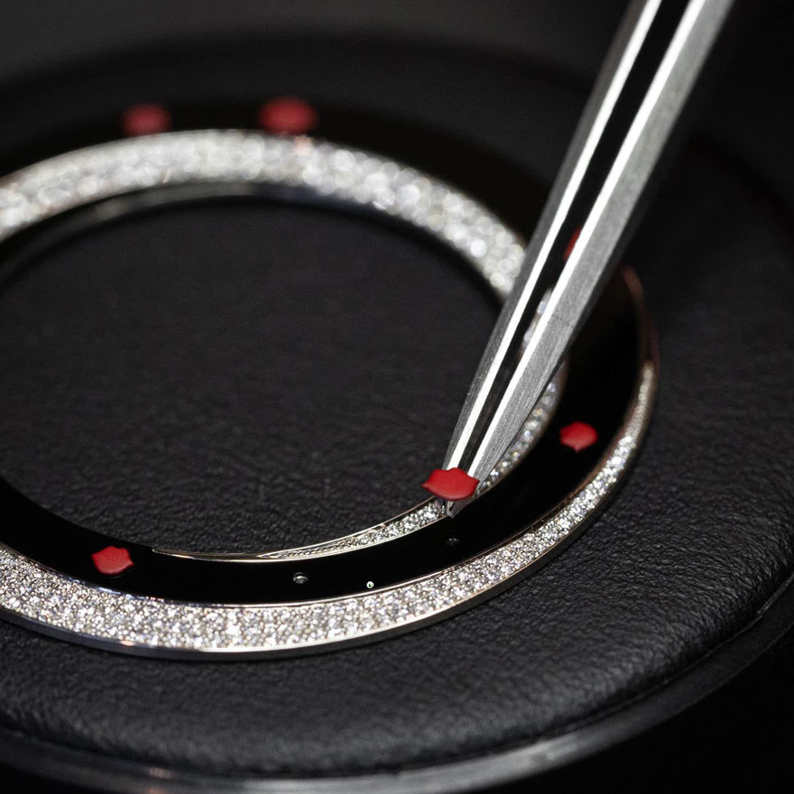 2022年以降、ジャケ・ドローはユニークピースを中心に製作するブランドへと方針を変えた。今回ジャケ・ドローが発表した「ラ・ロン・デ・ベゼ・オートマトン(La Ronde des Baisers Automaton)」はファッションデザイナー、シャンタル・トーマスとコラボレーションした腕時計だ。Baiserとはフランス語でキスを意味し、あらゆる口付けをたたえるオートマトンを搭載した腕時計なのである。