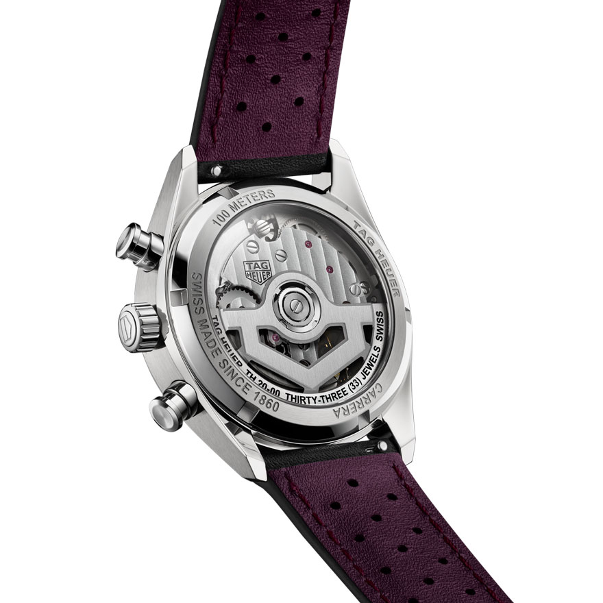 「タグ・ホイヤー カレラ クロノグラフ」の内部には、その信頼性と性能で高く評価されている自社製ムーブメント、Cal.TH20-00を搭載。オープンケースバックからその雄姿をのぞくことができる。約80時間のパワーリザーブを備えるこのムーブメントは、質感を高めるためにポリッシュ仕上げとサテン仕上げを交互に施した39mmステンレススティール製ケースに収められている。