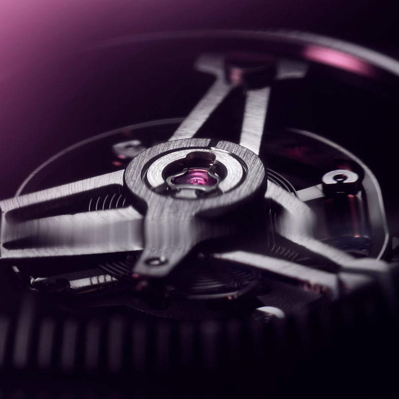 ケースには、ダイアルのグラデーションを引き立てるサンレイ加工サテン仕上げが施され、ブラックのアウターリングとパープルの中央部分との間のダイナミックなコントラストを演出。また、ロジウムコーティング仕上げのインデックスとシルバーのアクセントが、この時計に控えめながらも洗練されたエレガンスをもたらしている。