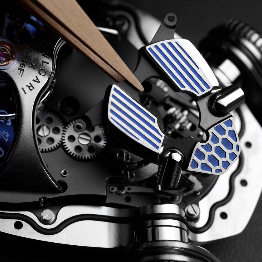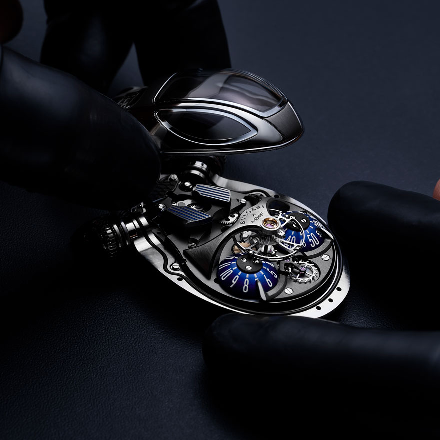 このユニークな新作の起源が「セルペンティ」であることは明らかだが、MB&F のマクシミリアンとブルガリのファブリツィオ、このふたりのクリエイターにはもうひとつの着想源があった。ふたりはともに自動車デザインの愛好家であり、数々の同じ自動車の影響を受けてきた。セルペンティ MB&F 限定モデルに自動車のデザインコードを組み込むことは初め予定されていなかったが、その影響は随所に感じられる。滑らかな自動車のボディーワークを連想させるケース、スポーツカーのリアウィンドウのルーバーのように細かな段差が施されたサファイアクリスタル、車のホイールを彷彿とさせるリュウズ、そしてムーブメントにも、以前の「セルペンティ」に見られる六角形のスケールモチーフを持つグリルなど、自動車のエンジンを想わせるコンポーネントが含まれている。
