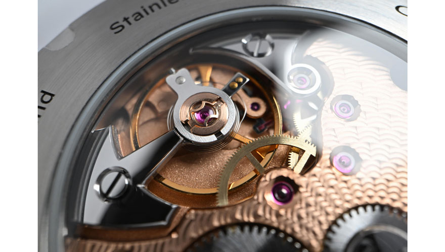 ケースはポリッシュ仕上げのステンレススティール製で直径37mm、厚さ8mmとスリムなサイズだ。文字盤側はダブルドームのサファイアクリスタルで無反射コーティング付き、ケース裏面はフラットなサファイアクリスタル製で、複雑なムーブメントを鑑賞できる。ヴィンテージスタイルのシリンジ針は 0.2mm 厚のスティール板からカットされた後、手作業によってヤスリをかけて丸みを持たせ、ミラーポリッシュ仕上げを施す。明るい色の文字盤の場合、針は焼入れによってブルースティールに仕上げられる。