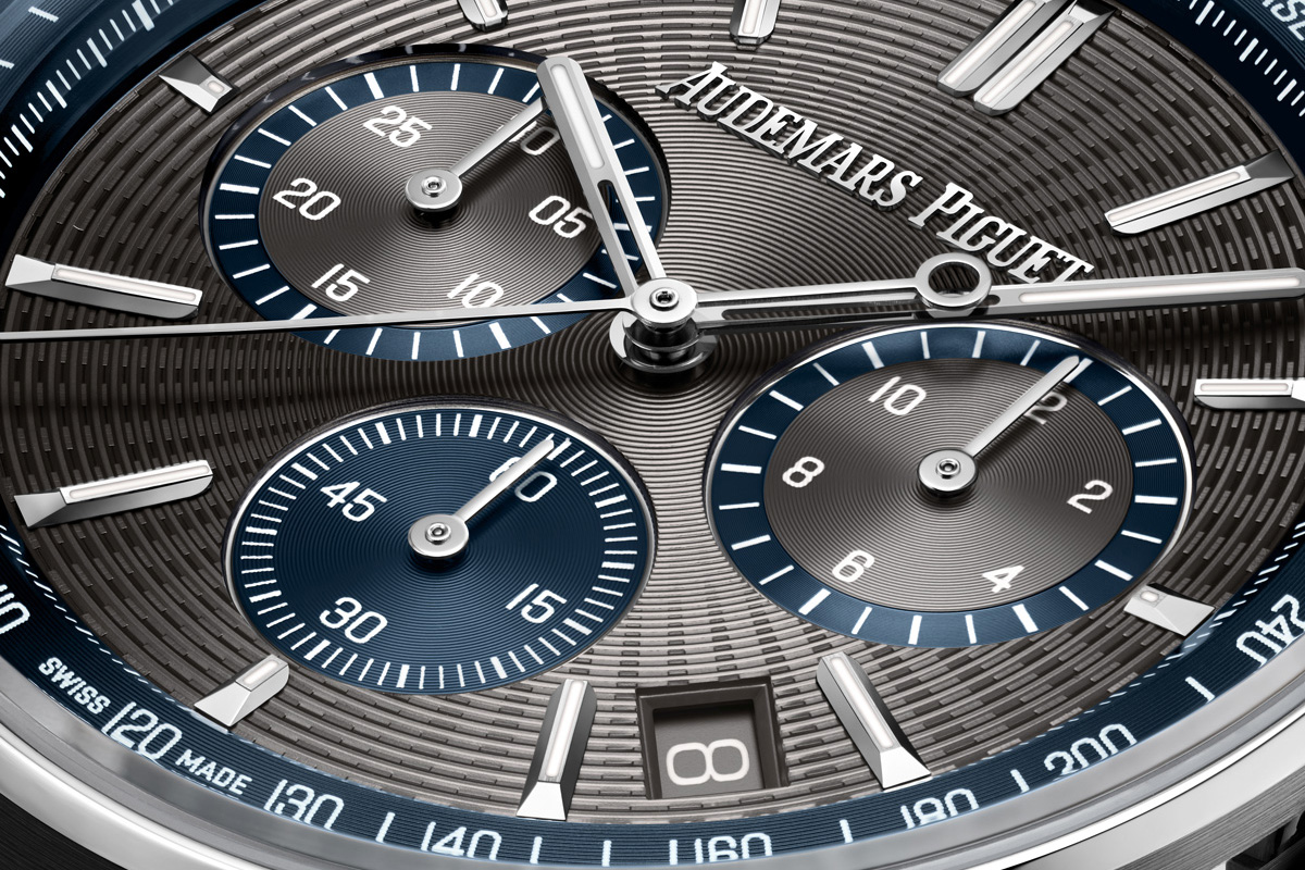 特徴的なグレーはガルバニック処理によって実現。そこにアクセントとして組み合わされるのは「ナイトブルー、クラウド 50」と呼ばれる青色だ。1972年の初代「ロイヤル オーク」に用いられて以来アイコンと化した色だ。