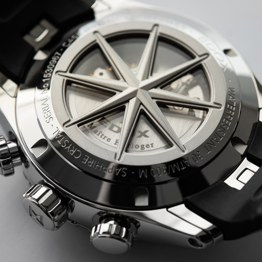 10個のパーツから構成されるケース、独特のノッチが刻まれたベゼル、3本のケースラグを通じてケースとシームレスに接続するラバーストラップなど、大海原への航海を思い起こさせるようなパワフルかつエレガントな構造美が印象的なモデル。梨地仕上げのダイアル中央部分に対し、サブダイアルとアワートラックにはスネイル仕上げを施し、視認性が一層高められた。航海に欠かせないコンパスを模したケースバックからは、自動巻きムーブメントを鑑賞することが可能だ。エドックスらしい高い防水性能(300m)も保持している。