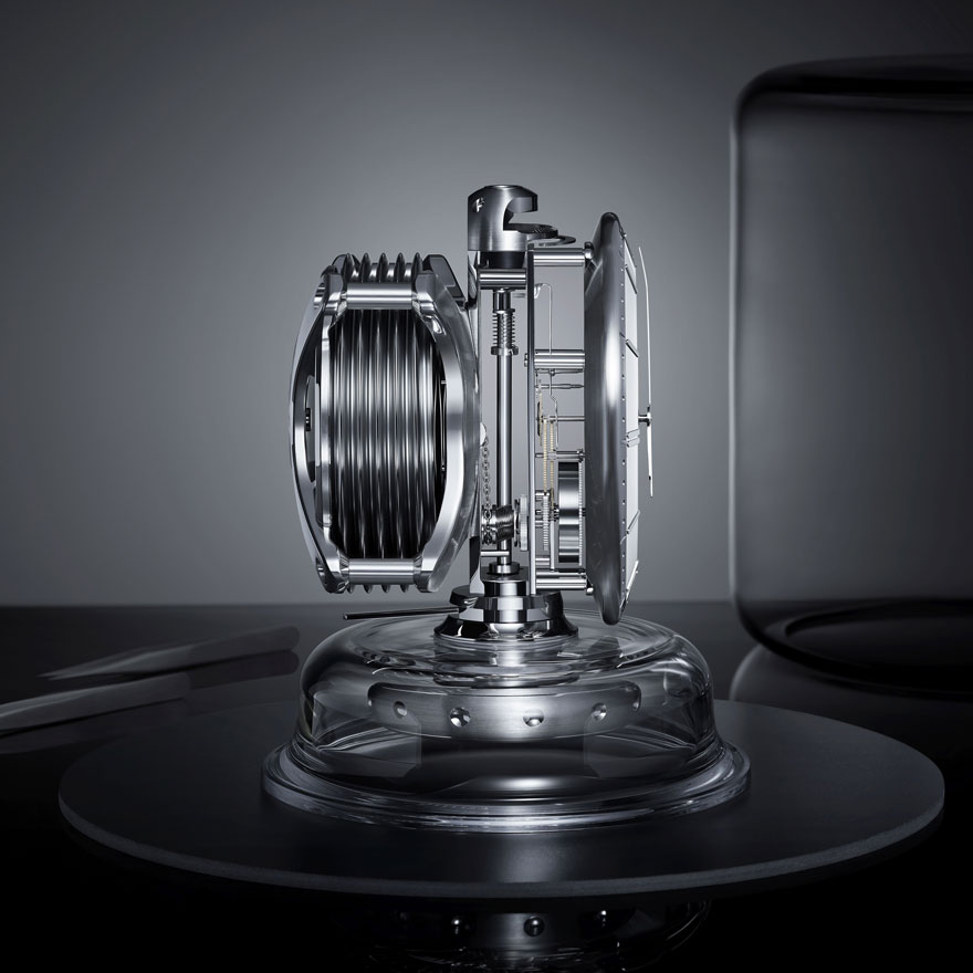 実際には、ほとんど目に見えないようにデザインされたガラス製のサポートで機構が保持されている。これによって、時計を動かし続ける蛇腹やチェーン、歯車などを搭載した機構全体をあらゆる角度から眺めることができるのだ。
