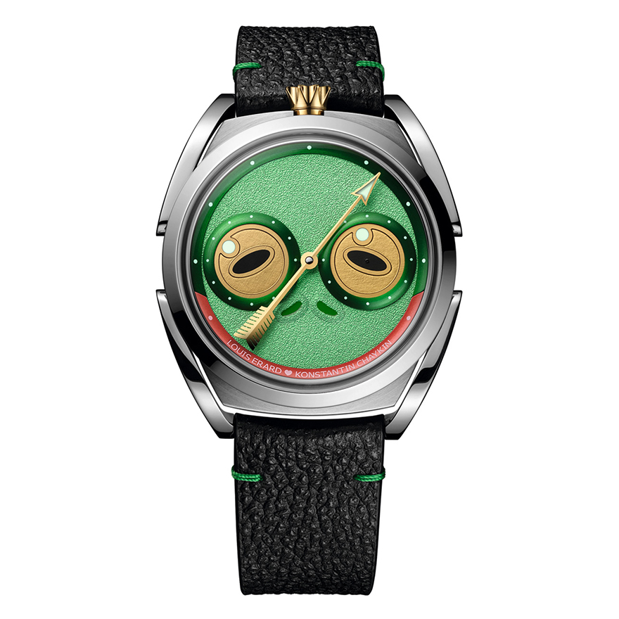 ルイ・エラールは、コンスタンチン・チャイキンと再びコラボレーションを行い、カエルをモチーフとする「ルイ・エラール X コンスタンチン・チャイキン アンフロゲッタブル」を発表した。ルイ・エラールのアイコンであるレギュレーター表示を水平に配置し、各表示によってカエルの表情を描き出している。チタン製のケースは、カエルの脚を思わせるラグを持ち、カエルが座っている様子を思わせる仕上がりである。