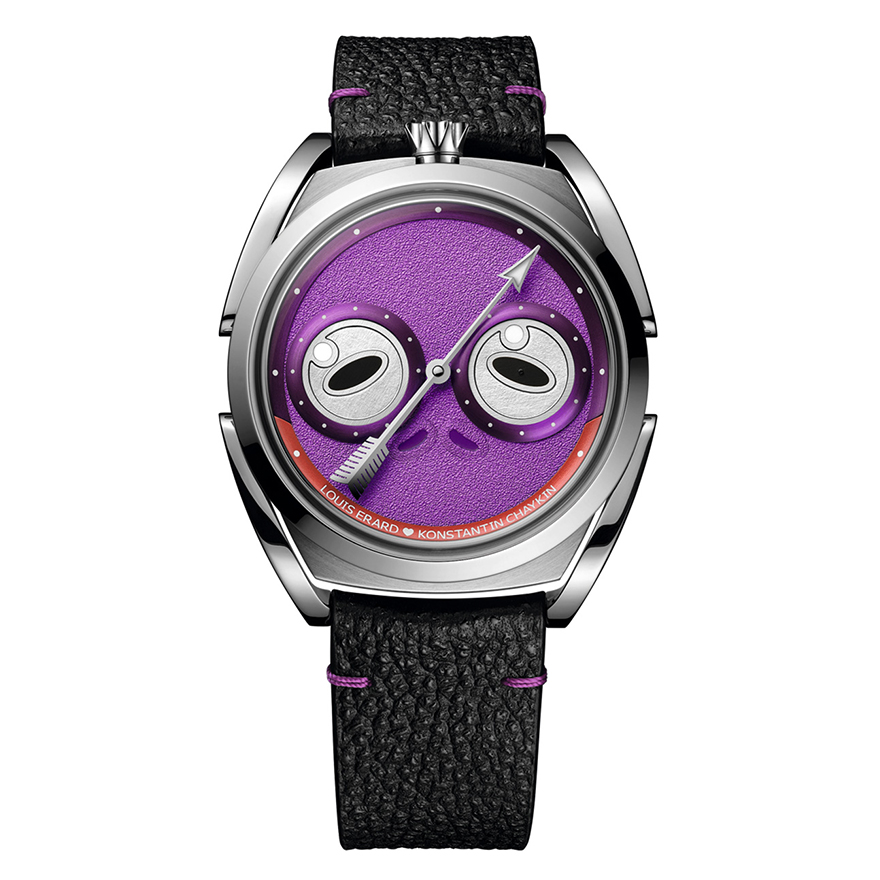 文字盤はバイオレットまたはフォレストグリーンのグレイン仕上げで、ラッカー仕上げの鼻孔パーツや、「Louis Erard ❤ Konstantin Chaykin」の刻印を配した分スケールのリングなど、ディテールにもコラボレーションらしい遊び心が盛り込まれている。