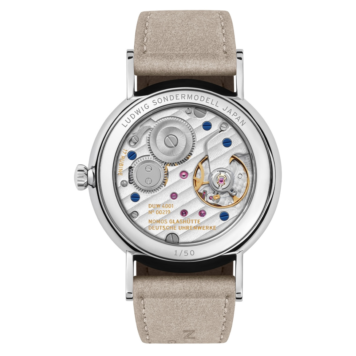 ムーブメントは、薄型手巻き式のCal.DUW4001を搭載している。ストライプ装飾と面取りが施された受けや、ブルースティールのネジ、赤い人工ルビーを、シースルーバックから眺めて楽しむことができる。ケースバックの外周には限定数を表す番号が刻まれ、数量限定モデルならではの特別感を味わうことが可能だ。
