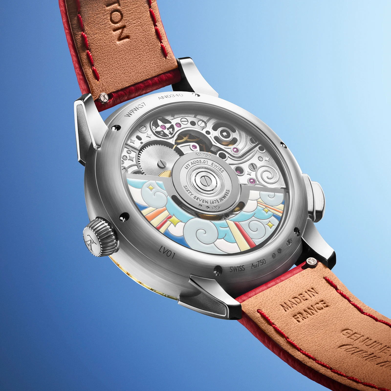 またシースルーバックからはムーブメントを鑑賞することが可能だ。18Kホワイトゴールドローターのミニアチュールペインティングをはじめ、ルイ・ヴィトンのアトリエであるラ・ファブリク・デ・ザールの職人技が注ぎ込まれている。