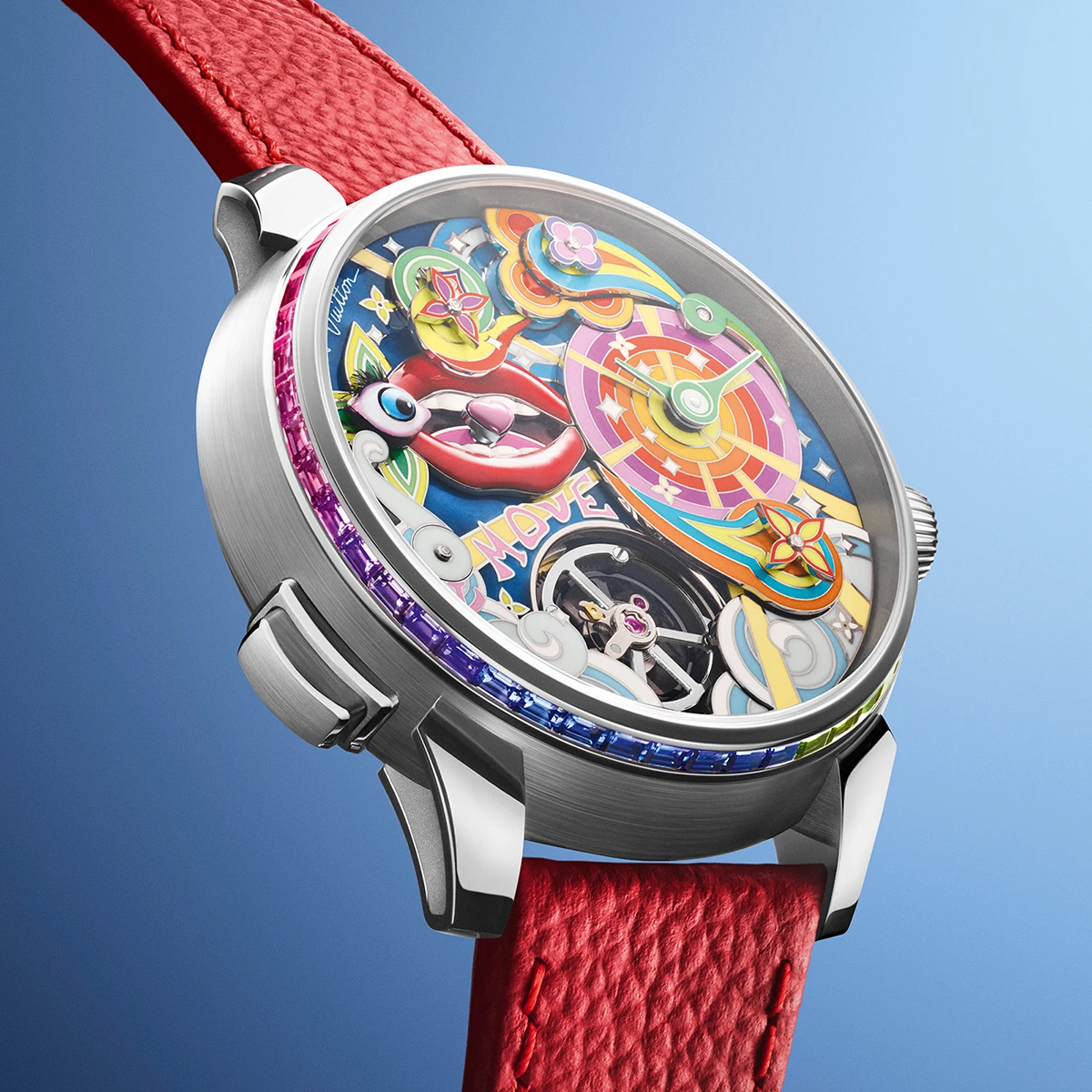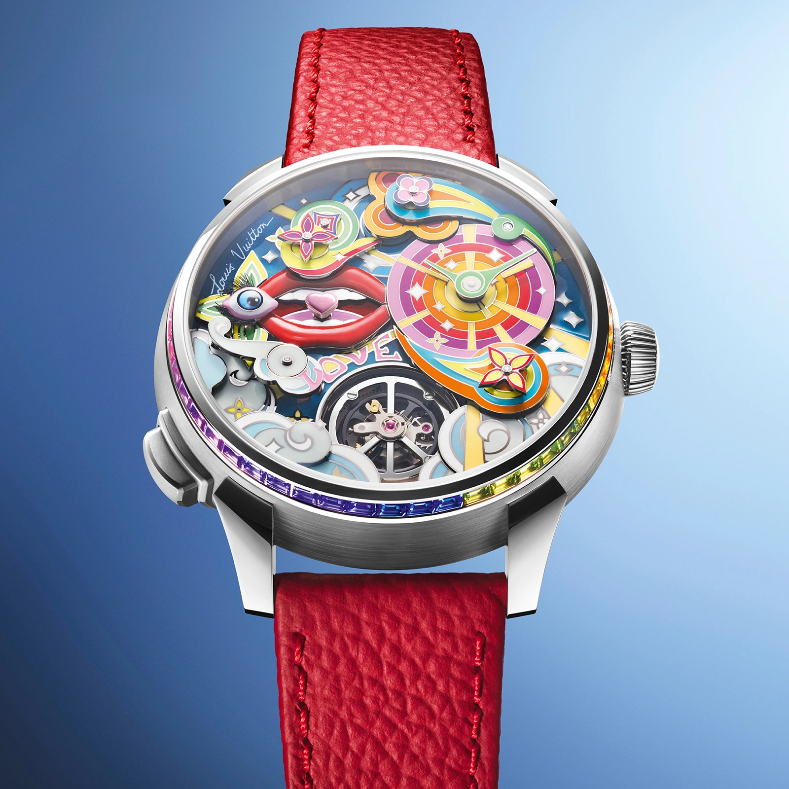 23色のグラン・フー エナメルを使用し、250時間以上をかけて製作されたダイアルには、シャンルベエナメルをはじめとする同社の誇るエナメル技術がふんだんに用いられている。20のミニチュア要素が異なる高さで配置された多層構造が、モノグラムフラワーや、リアルフェザーによる睫毛をあしらった目、真っ白な歯がのぞく唇などを立体的に演出する。