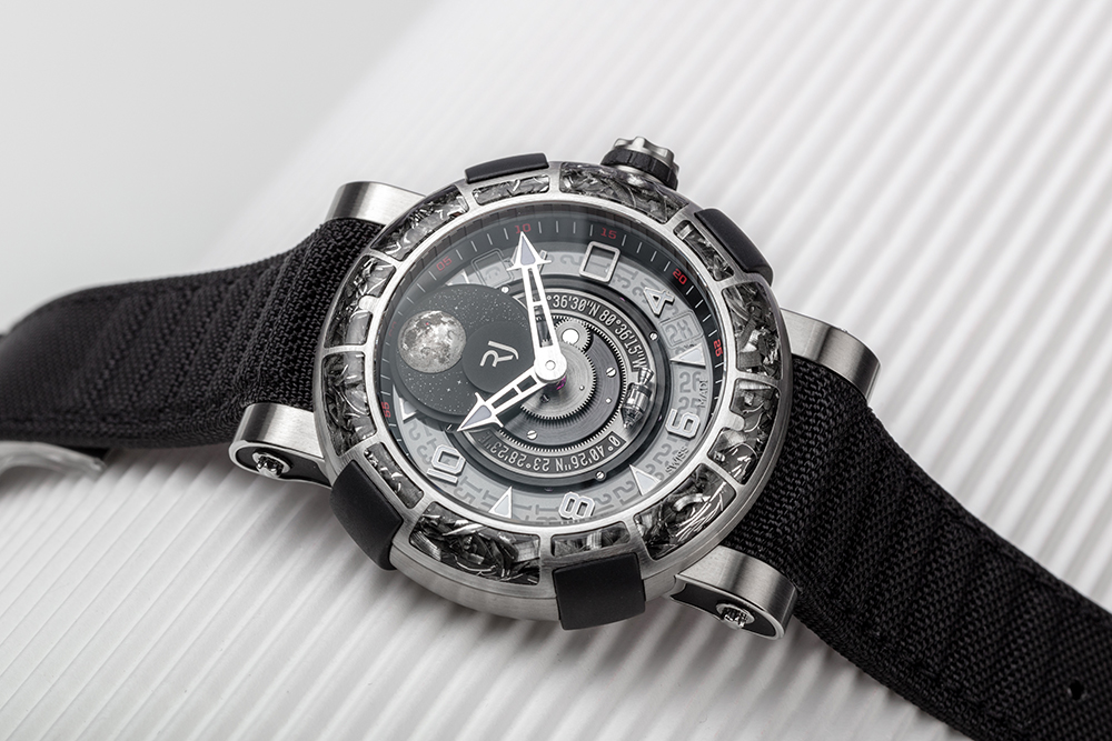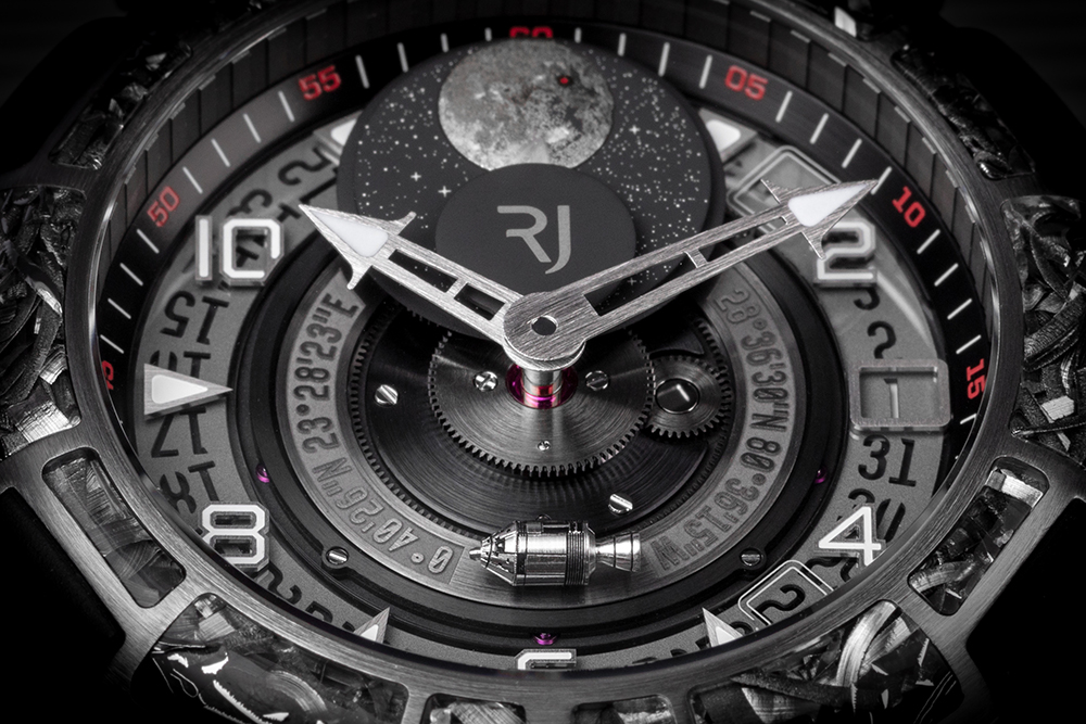 またダイアルで目を引くムーンフェイズは、それ自体が月の周期に合わせてダイアル上を1周するというユニークなものだ。月相はRJロゴが隠すことで表現される。