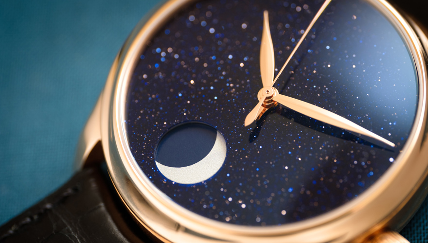 6時位置の美しいプロポーションの窓の中で、銀色の月が満ちていく。斬新でありながら控えめに表現された月だ。H. モーザー社は、このピュアな詩情溢れるデザインに、インデックスもロゴも排したコンセプトダイアルを組み合わせ、まったく自由に月の姿を表現してみせた。さらに、月の美しさを引き立てるために、夜空に浮かぶ星座のような細かい粒子が輝くアベンチュリン素材のダイアルが採用された。