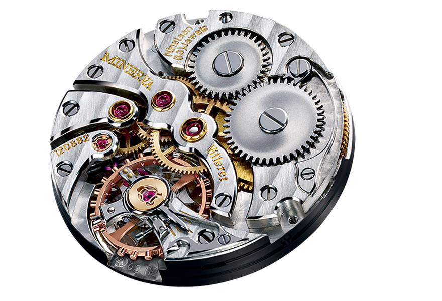 Cal.MB M62.00は1948年に製造されたミネルバの通称、「ピタゴラスキャリバー」の設計を受け継ぎながら、よりハイエンドな仕上げを与えて2003年に登場したムーブメントだ。そのため、振動数1万8000振動/時と昔ながらのロービートが特徴。緩急針のみならず、テンワに装備されたチラネジによって緩急調整を行う古典的な手巻き式の同ムーブメントは、プレートとブリッジのいずれにもロジウムメッキが施されたジャーマンシルバー製が使用される。また、ブリッジにはコート・ド・ジュネーブ装飾が施されており、仕上げの美しさも目を引く。