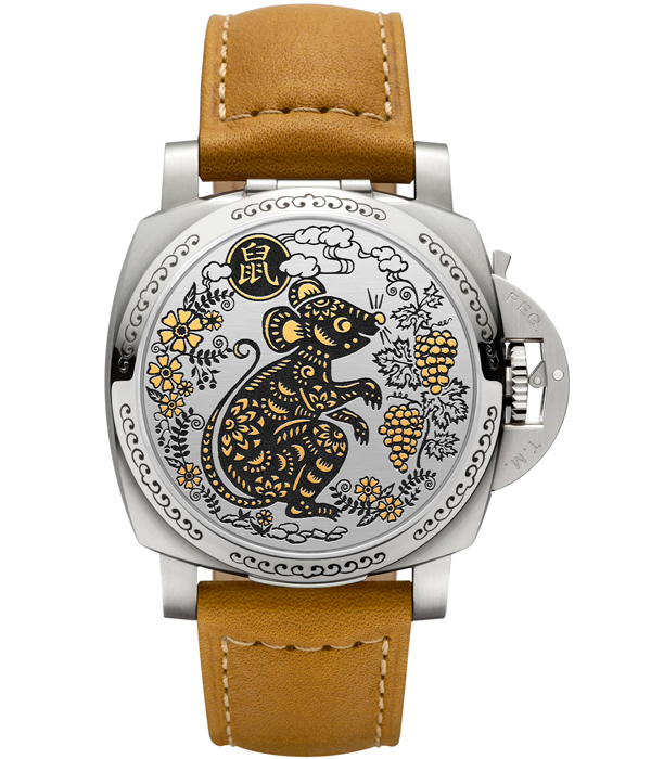子年生まれは、インスピレーションと知性に溢れ、野心的で聡明といわれている。ネズミの資質である賢さによって、あらゆる状況に適応し、日常生活に起こる困難を簡単に克服し、落とし穴を回避する。ルミノール シーランド – 44mmのスティール製の上蓋には、そのネズミが描かれた。これまでの全てのシーランドモデルには装飾が施された上蓋があり、そしてその裏側にはミラーがあしらわれ、12時位置で44mmの316Lスティールケース本体に接続している。