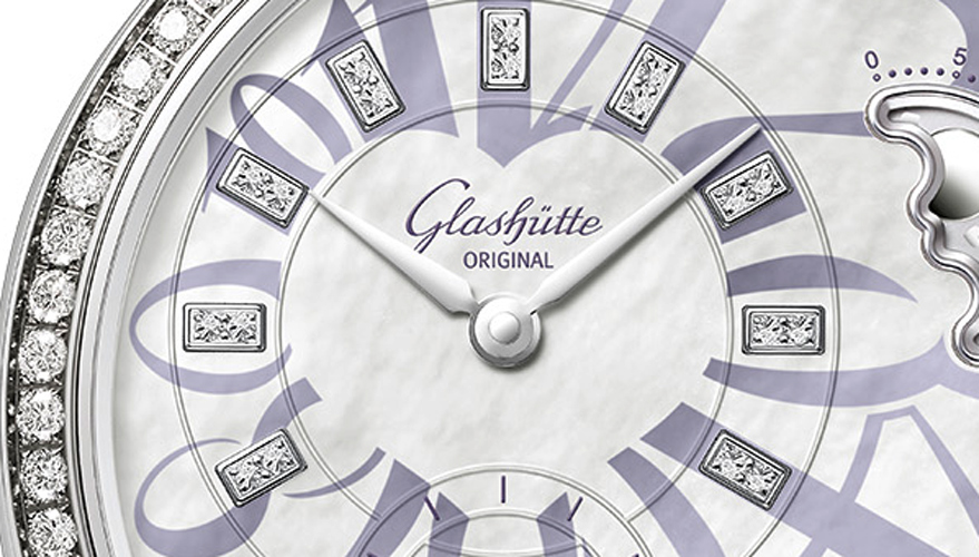 男らしいイメージが強いグラスヒュッテ・オリジナルに、意外なほど女性らしいモデルが登場した。文字盤はダイヤモンドをセッティングしたバーインデックスとライラックのアラビック数字に囲まれた内側がハート形となっており、ソフトで遊び心のある印象を与える。このパノマティックルナは世界25 本限定で、フェミニンなマスターピースがレディースコレクションに追加されることになった。