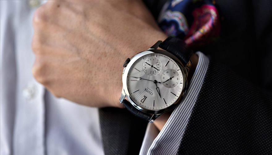 チャペックの独自性は、ブランドの特徴でもあるサブダイアル(スモールセコンドとパワーリザーブ表示)による2つのフォーカル・ポイントが存在するということに尽きる。その2つの焦点からの曲線が、魅惑的な「波の干渉」効果を文字盤に生み出すのだ。チャペック社が特許を持つリコシェ・パターンは、パートナーであり、スイス最高のハンドメイドのギョーシェ・ダイアルメーカーのひとつであるMetalem(メタレム)社と共同で制作されている。