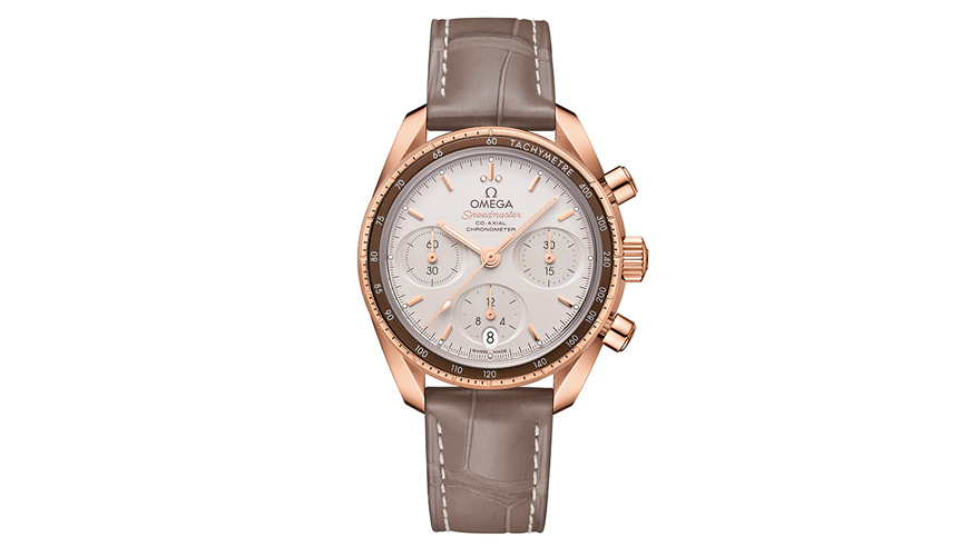 クラシックなムーンウォッチのデザインに、洗練されたスタイリッシュな装いが魅力の「スピードマスター 38mm」は、ユニセックスモデルとして世界中の人々が憧れる時計だ。新作は、18Kゴールドという最高の素材をケースに採用し、伝説的なスピードマスターのデザインがよりラグジュアリーに昇華した。スピードマスターコレクションが本来持つダイアルカラー、楕円形のサブダイアルや優美な流線を描くフォルムは、リッチな18Kゴールドと見事に調和する。