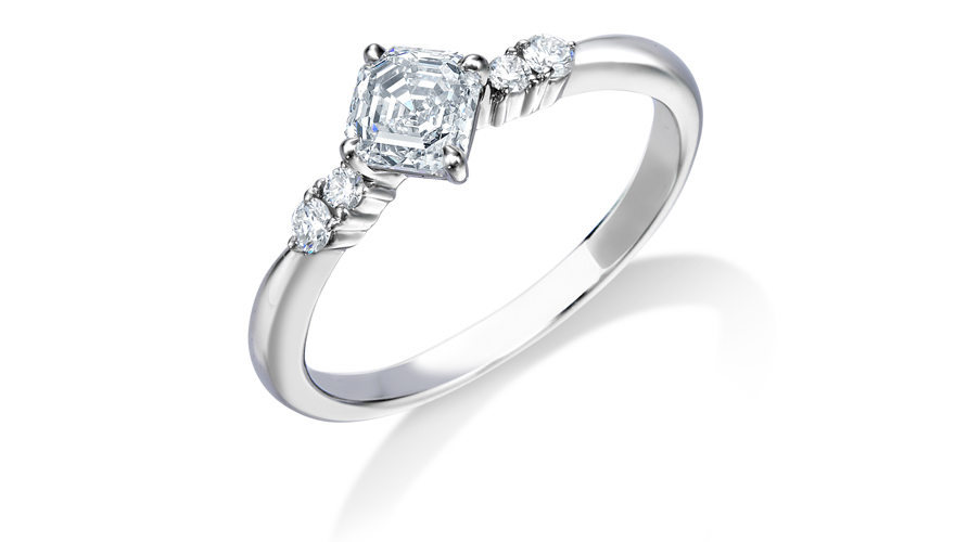 英国王室の至宝「カリナン」をカットした天才、3代目ジョセフ・アッシャーによって生み出された「アッシャー・カット」。革新的な八角形のフォルムは一世を風靡し、他社が追随するほどの模範的なカットとして今でも知られている。その後、一世紀の時を経て2000 年に5代目のエドワード・アッシャーが「アッシャー・カット」を改良して生み出した「ロイヤル・アッシャー・カット」。カリナンのファセット数と同じ74面を有し、上品で透明感のある輝きに加え、戻ってくる光の総量が更に多くなるよう考案された。