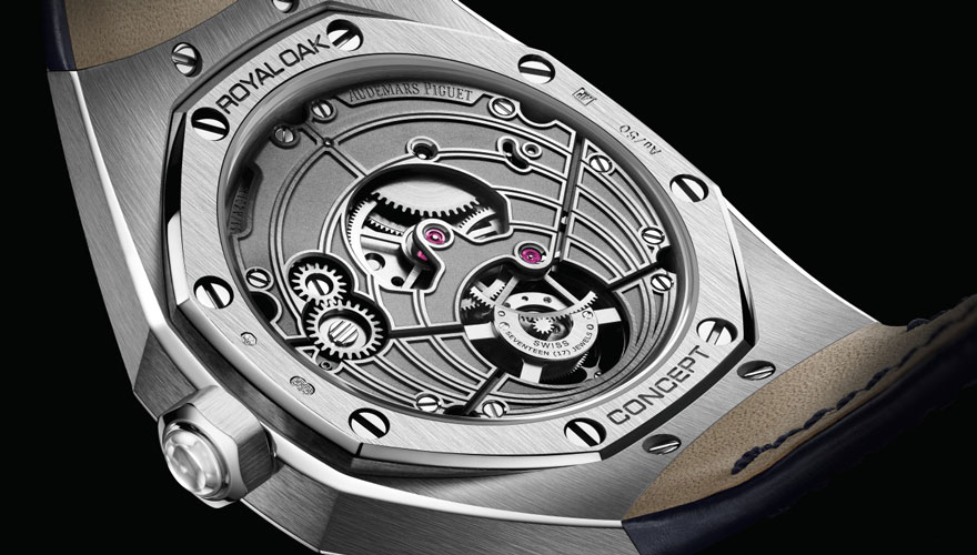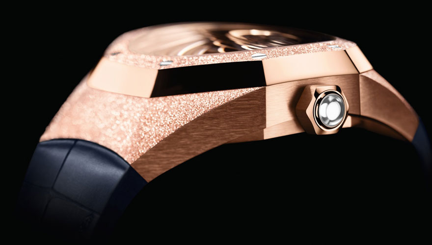 K18ピンクゴールドとK18ホワイトゴールドで展開されるロイヤル オーク コンセプト フライング トゥールビヨンの新作では、輝きを放つフロステッドゴールド仕上げのケースに、幾重にも重なる層から成る現代的なダイヤルが合わせられている。ロイヤル オーク コンセプトのケースとしては初めて、フィレンツェの伝統的なジュエリー技法であるフロステッドゴールド仕上げを採用した。先端にダイヤモンドのついた治具で仕上げることで金の表面に細かな加工を施し、まるでダイヤモンドダストのように、貴石にも似た輝きをもたらす効果が生まれる。