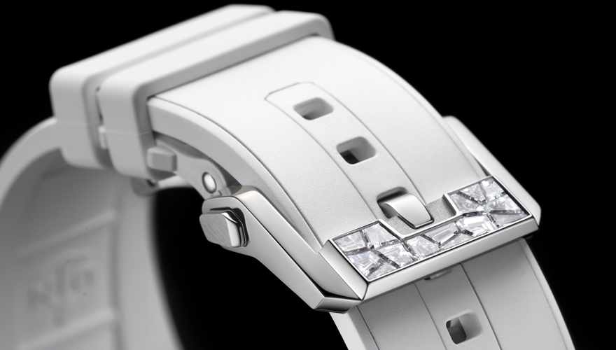 自己展開型バックルには、1.22カラットのピュアな輝きを装飾し、またリューズ、ベゼル、インデックスの針にも手作業でファセット加工のダイヤモンドをセットし、隅々までオリジナルの芸術作品になっている。波を照らす太陽の光を浴びながら、水深50m まで楽しむことができる宝物と言えよう。