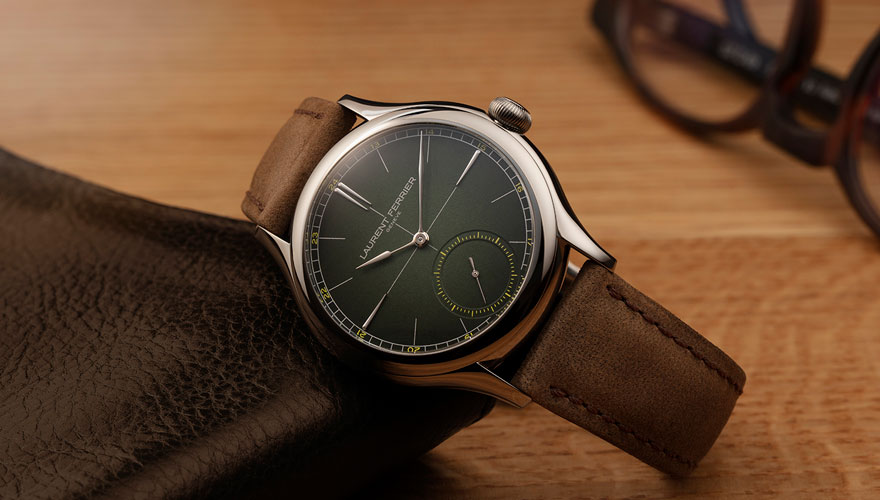 中央の透明感のある淡いグリーンから外縁に向かって深いグリーンへと移り変わる、グラデーションを表現したオパライン ダイヤル。スレートグレーのアワートラックには、鋭いイエローの数字でアクセントが打たれ、全体にスポーティさが加えられた。シャープなイエローの目盛で縁取られた6時位置のスモールセコンドには、バトン型針を合わせている。3本の針は、すべて18Kホワイトゴールド製で、リューズはメゾンを象徴する“ボール”型。この「アトリエシリーズ」の新作は、ローラン・フェリエの工房で30本のみ限定生産され、ウェブサイト上でダイレクトに販売される。