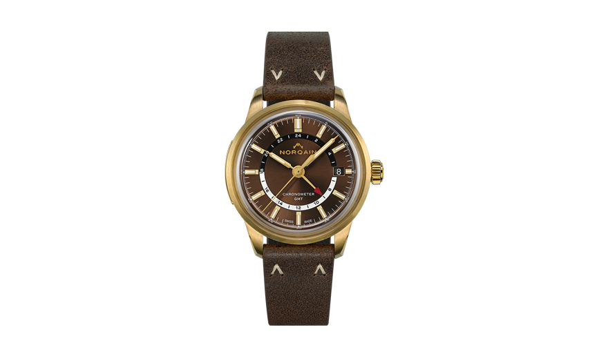 今回の発表のハイライト「Freedom 60 GMT」は、ノルケインが発表する初めてのGMT 機能搭載モデルだ。ステンレススチールモデルに加え、世界限定300 本のブロンズモデルも用意された。ブロンズケースは、サテン仕上げとポリッシュ仕上げが組み合わされ、ブロンズのカラーは黄色く仕上げられた。愛着を持って使い続けていくうちに落ち着いた色合いになっていくだろう。素材はシリコンアルミニウムブロンズ合金。既存の時計ケースに採用されるブロンズに比べて、腐食や摩耗に対し非常に耐性が高く、一般的には船舶部品に使用される金属だ。またベゼル、ノルケインプレート、職人による手仕事により植字されたインデックス、オールドラジウムカラーのスーパールミノバが施された針も、すべてブロンズ製で、クリスタルケースバックの外側のステンレススチールはブロンズ製PVD で処理されている。 ブロンズケースにマッチするシダーブラウンカラーの文字盤も魅力だ。