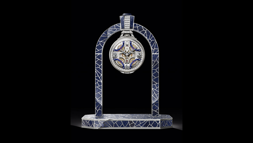 「アルティメイト・クアドリ・トゥービヨン・バイ・ハリー・ウィンストン」は、NY5 番街にあるハリー・ウィンストン本店のエントランスを飾るネオクラシックの建築様式が採用されたアーチを模したスタンドからタイムピースが吊るされており、その姿はまで宙に浮いたかのようだ。18Kホワイトゴールドのアーチには、ブルーの魅惑的な輝きを放つアベンチュリンのマルケトリと、18個のバゲットカット・ダイヤモンドが配されている。またスタンド頂点のアベンチュリンを配したプッシュボタンを押すとタイムピースがアーチから外れ、付属の18Kホワイトゴールドのチェーンとともにポケットウォッチとして使用できる。