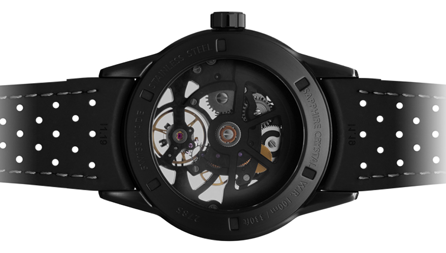 アンスラサイトカラーのムーブメントを基調とし、ブラックPVD 加工を施したステンレススティールケースや、スモークサファイアクリスタルを用いたシースルーケースバック、グレーステッチを採用したブラックラバーストラップを組み合わせるなど、ブラック × グレーのワントーンでまとめ洗練された雰囲気に仕上げられた。既存モデルに採用されているインデックスを取り払い、美しくカラーリングされたムーブメントが眺めやすくなるようバージョンアップしている。また、アラビア数字とバーを組み合わせて表示したフランジのミニッツマーカーと、パンチング加工のラバーストラップで、エネルギッシュでスポーティーなアクセントも加えられた。