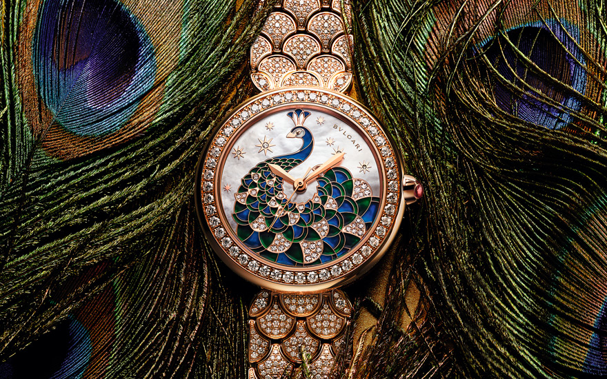 今回発表された「ディーヴァ ドリーム ピーコック」の3モデルは、その名の通り美しい羽根を持つクジャクをテーマとする。クジャクはローマ神話のディーヴァ(女神)であるユーノーのシンボルとされ、古代ローマのモザイク画にもたびたび描かれている鳥だ。そのきらびやかな姿は、コレクションがオマージュを捧げる女性像と重なる。