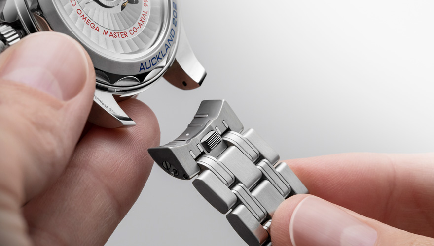 「シーマスター ダイバー300M アメリカズカップ クロノグラフ」には、メタルブレスレットと予備のラバーストラップが付属しており、オメガの新技術であるクイック チェンジ システムが採用されている。ボタンを1 回押すだけで、ウォッチヘッドからピンを外すことができ、用具を使わず簡単にブレスレットとストラップを交換することができる。
