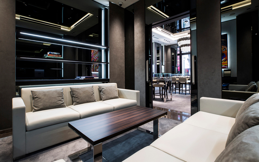 このモダンな内装デザインは、昨年オープンしたウブロブティック銀座やウブロブティック名古屋と共通するもの。国内の直営ブティックでは、ウブロブティック大阪が最も高い天井を持つ店舗となっており、通りに面した窓から差し込む自然光とともに開放感あふれる空間を演出している。また他店舗同様、店内にはブティックVIPのVIPルームも設けられている。