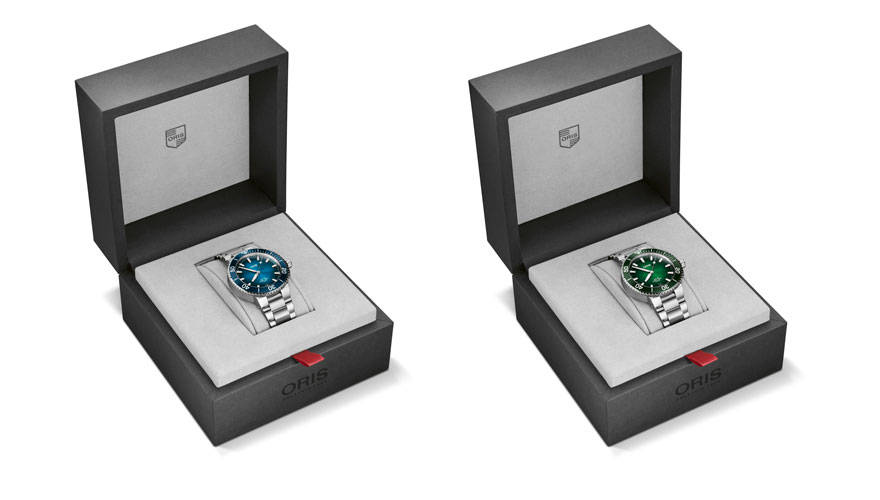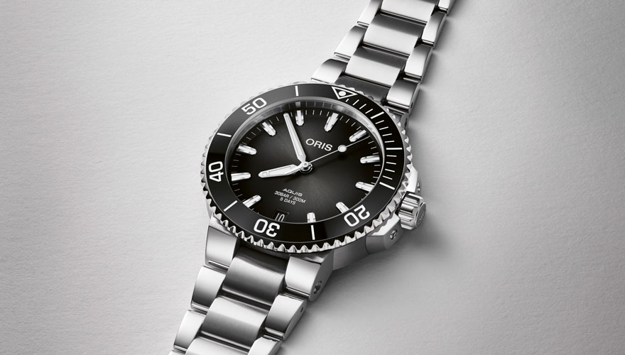 オリスの自社キャリバー400が小ぶりな41.5mm径のアクイスデイトに初めて搭載された。非常に優れた耐磁性、クロノメーター基準を超える精度、約5日間パワーリザーブ、10年間保証を備える。ブルー、アンスラサイト、グリーンの3色が用意された。