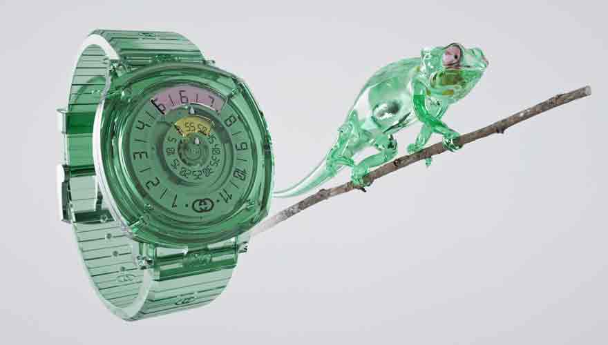 この極めて高度な技術によって作り出されたサファイアクリスタルのケースは、オリジナルのグリップのデザインにまったく新しい魅力をもたらした。時分の表示窓のカラーガラスの美しいコントラストはグッチならではの遊び心があふれたディテールだ。ケースと同系色の透明なラバーストラップにはインターロッキング G モチーフのエンボス加工が施され、ステンレススチールのアルディオンバックルがグリップのコンテンポラリーな個性を際立たせる。