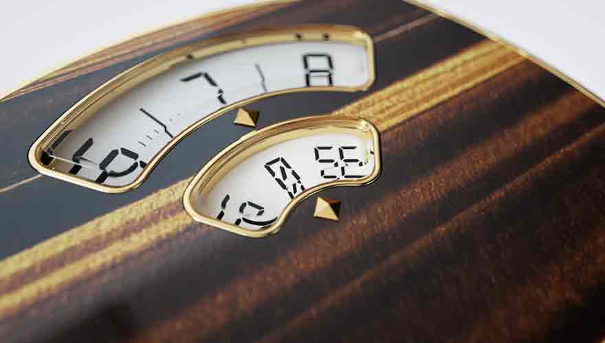 「グリップ サファイア」は、サファイアクリスタルのケースに、視線を引きつけるジャンピングアワームーブメントを備えた魅力的なデザインだ。クリア、ブルー、スモーキーピンク、グリーンの透明な4 カラーで展開され、ダイアル上で時と分を表示する窓はコントラストの効いたカラーで強調されている。レトロなデジタルスタイルと高度な加工技術によるプレシャスな素材の組み合わせ、伝統の職人技と最先端のテクノロジーの融合から、この上なくモダンなウォッチが完成した。