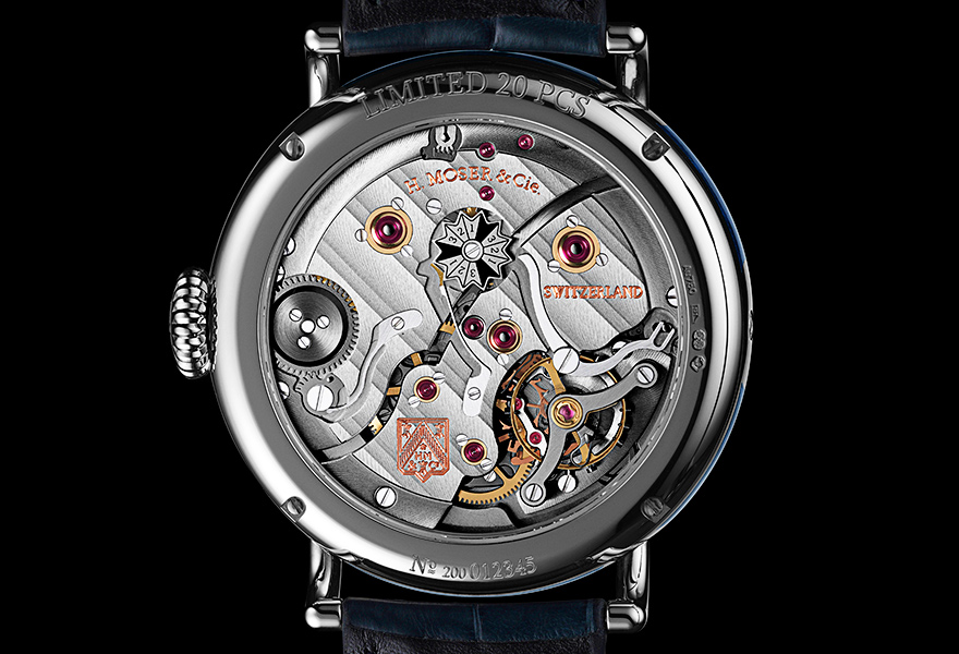 この時計の顔であるダイアルは、ケース側面とは異なる風合いのグラン・フー(高温焼成)エナメルを採用している。グラデーションをつけた「ミッドナイトブルー」は、H.モーザーが初めて取り入れた色だ。同社のお家芸とも言えるフュメダイアルを、古典的なアプローチで際立たせている。