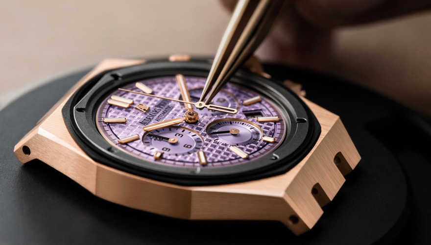 パープルダイヤルの「グランドタペストリー」パターンは、光を受けてカメレオンのようにカラーが変化する。この変化はダイヤルにパープルのPVDの層を何度も重ねることによって実現した。ウォッチのアングルや光によってトーンはピンクからパープルの間で変化しつつ、ブルーのニュアンスが繊細にからみあう。ダイヤル上には3 つのパープルのクロノグラフカウンター。18K ピンクゴールドのアプライドアワーマーカーとロイヤル オーク針はケースとブレスレットにマッチさせ、ダイヤルカラーとのコントラストを演出している。