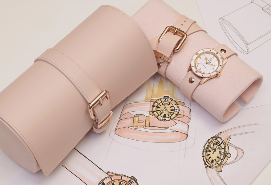 スタイリングに合わせてセレクトできるように新作には3 本のストラップが付属する。ピンクとブラック、そして二重巻きのエキストラロングのピンクストラップである。エキクストラロングのストラップを付けた際、時計の文字盤とMH ブランドのアイコンであるバックルが、着用者の手首で同じ面になるようアレンジが施されており、エレガントで遊び心ある演出となっている。すべてのストラップにはイージークリップが装備されているので、気分に合わせて、簡単に取り替えられる。付属のピンクのキャリングケースは、スタイリッシュで華やかさを備えながらも、さまざまなコンポーネントがしっかり収まる。このケースには、MH のトレードマークであるバックルの留め金が付いている。