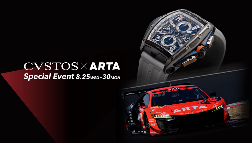 CVSTOS(クストス)は、2021 年の最新ウォッチコレクションとスポンサーを務めるARTA のSUPER GT 参戦マシンを展示するスペシャルイベントを、松坂屋名古屋店にて8 月25 日(水)~30 日(月) の期間限定で開催する。また、28 日(土)・29 日(日)には、ARTA の鈴木亜久里氏、土屋圭市氏が登壇し、国内外のトップドライバーが参戦する国際モーターレース SUPER GT 2021 への意気込みやレースへの思い、さらにクストスウォッチの着けこなしなど、ここでしか聞けないトークショーも開催される。