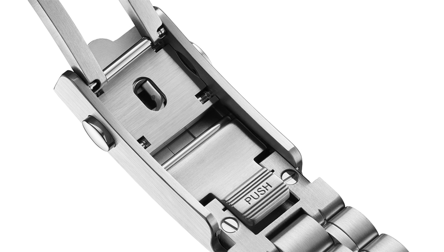 今回は、ポリッシュ&ブラッシュ仕上げのSSモデル6種類と、オメガ独自のブロンズゴールドを使用したモデルの計7種類が用意された。SSには、シルバーダイアルにブルーの針、ブルーダイアルにロジウム加工の針、シルバーダイアルにブラックのサブダイアルを配した“パンダ”ダイアルがあり、それぞれにブレスレットとレザーストラップがラインナップされている。ラグ間21mm/バックル部分16mmとテーパーをかけたデザインのブレスレットは、特許取得のコンフォートリリースシステムによって、2.3mmまで2段階の調整が可能。ベゼルリングは、ブルーまたはブラックの陽極酸化アルミニウム製である。