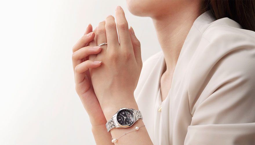 光発電エコ・ドライブ。スーパーチタニウムTM(デュラテクトプラチナ)。⽇常⽣活⽤防⽔。