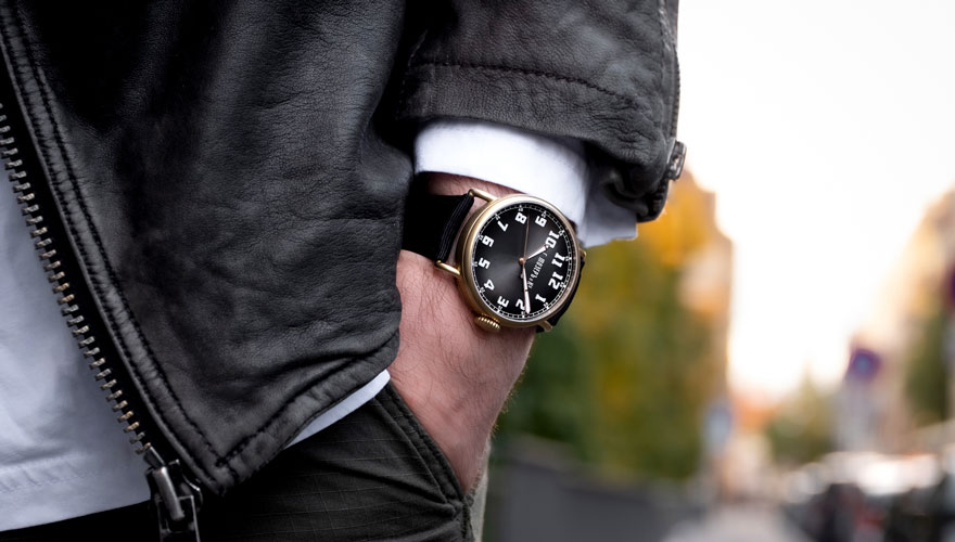 1920 年代初頭に懐中時計を精巧なアタッチメントを用いて作り変えた腕時計からインスピレーションを得たヘリテージ コレクションは、一見して古典的なモデルであることが理解できるだろう。「ヘリテージ ブロンズ“Since 1828”限定エディション」は、19世紀に時折使用されていたキリル文字のロゴを配したフュメダイアルと、モーザー初のブロンズケースを採用することで、コレクションの持つ歴史的な側面をさらに強く押し出したモデルだ。