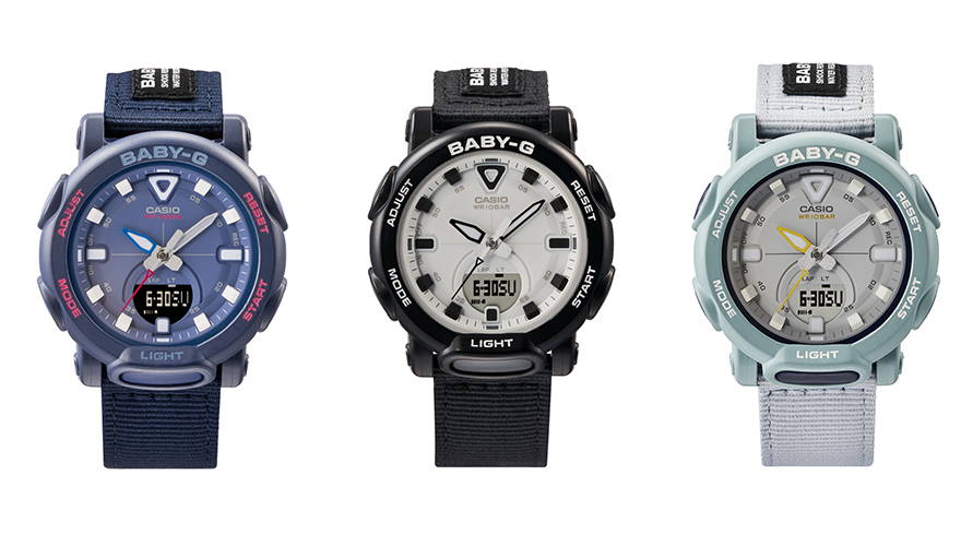 樹脂バンド仕様のBGA-310(コーラルピンク、コットンベージュ、ホワイト)と、クロスバンド仕様のBGA-310C(ネイビー、ペールブルー、ブラック)は、ともにケースカラーに合わせたバストラップが合わせられ、コーディネートのワンポイントカラーとしても取り入れやすいものとなっている。また、クロスバンドはペットボトルの再生素材から作られた糸を使用したものだ。