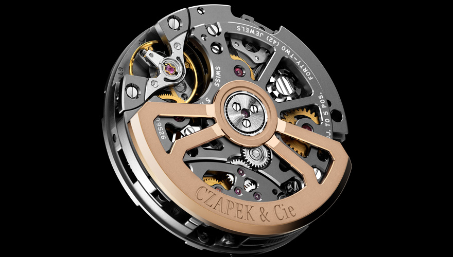 どちらのモデルにも、ヴォーシェ・マニュファクチュール・フルーリエ(Vaucher Manufacture Fleurier)によって製造された、チャペック社独自のビスポーク・ムーブメント、キャリバーSXH3が搭載されている。COSC認定済み。コラムホイール、垂直クラッチを備えたクロノグラフ・ムーブメントであり、振動数は36,000振動/時(または5ヘルツ)の高振動である。この自動巻きムーブメントには、サンドブラスト、スネイルなど優れた仕上げがなされている。